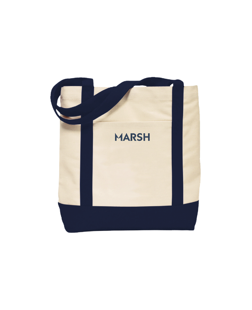 All-purpose tote with snap closure. Contrast bottom and handles in navy. Open front pocket for easy access. 22" double stitched handles.